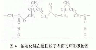 根據(jù)分散介質(zhì)不同,分散體系可分為水性體系(以水為介質(zhì))和非水體系(以有機溶劑為介質(zhì))。超分散劑最早是為解決顏料粒子在有機溶劑介質(zhì)中的分散問題而研究開發(fā)的,目前已在非水性涂料與油墨中獲得廣泛應用,并逐步向填充塑料、陶瓷漿料、導電聚合物及磁記錄材料等領域擴展。如張雪莉等人曾對以聚己內(nèi)酯為溶劑化鏈的超分散劑在磁性粒子表面的吸附情況進行了研究,其結構如圖4所示。